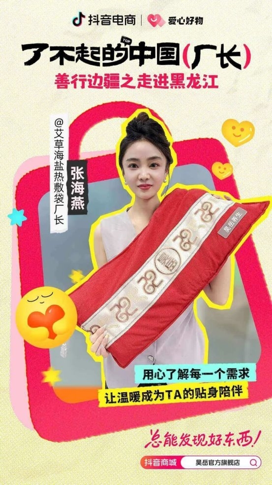 @吴岳官方旗舰店 主理人张海燕希望帮助消费者通过热敷抚慰工作生活中疲惫,开厂研发了一款搭载了精准控温技术的电加热艾草海盐热敷袋产品,在入驻抖音电商平台后,品牌声量在“了不起的中国厂长”IP活动中得到快速爆发。张海燕常对团队表示,“我们既是做产品,更是做陪伴”,对于本届“善行边疆”暖冬活动,张海燕通过捐献的方式,将这份温暖与陪伴送到了边疆孩子的身旁。