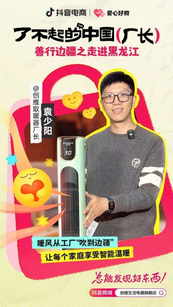 @创维生活电器旗舰店 创始人袁少阳深耕家电行业十余载,执拗于做产品创新的他,匠心打造了“语音控制+加湿取暖”的新一代智能家居产品,在“了不起的中国厂长”IP活动加持下,销量迅速爆发,单场GMV突破千万规模。本就重视产品价值与社会责任结合的他,曾在公司内部成立了“暖冬守护计划”,为需求人士送去关怀,而本届“善行边疆”暖冬公益活动,恰好为他提供了一个全新的公益平台。“温暖不仅是产品,更是责任”,正是马欢钰始终恪守的经营信念。