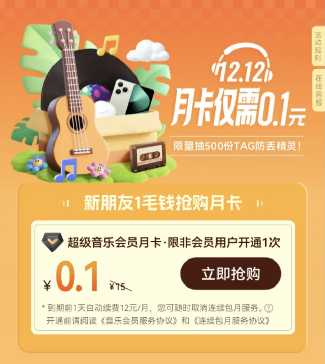 - 萌新限时薅羊毛!0.1元解锁30天超级音乐会员