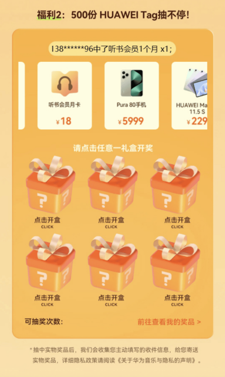 凡在双12活动期间开通年卡,除了实现听歌自由,还能直接领取华为主题、华为阅读、华为视频3个月会员。这还没完——所有开通年卡的用户都能参与限时抽奖,Pura 80 手机、HUAWEI MatePad 11.5S、HUAWEI Sound X4 智能音箱、HUAWEI FreeBuds Pro5 耳机、华为智能体脂秤 3,还有足足 500份 HUAWEI Tag 防丢精灵,以及随机艺人周边/签名照、听书会员月卡等你“认领”!