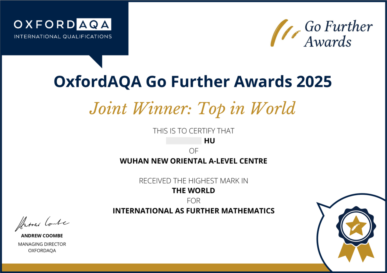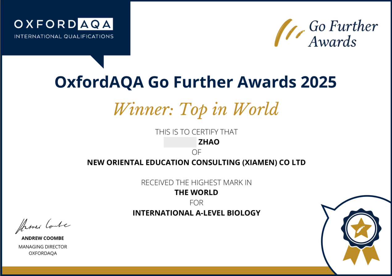 尤为重要的是,来自武汉新东方彼岸ICC国际课程中心的HU同学在牛津AQA2025考季AS进阶数学科目上取得全球最高分,来自厦门新东方彼岸ICC国际课程中心的ZHAO同学在A Level生物科目上取得全球最高分。两位学子均获得GoFurtherAward学生成就奖-全球最高分的荣誉,武汉、厦门两所分中心也被牛津AQA官方授予学术成就奖,卓越的成绩再一次展示了新东方彼岸ICC国际课程中心的教学实力与学术培养能力。