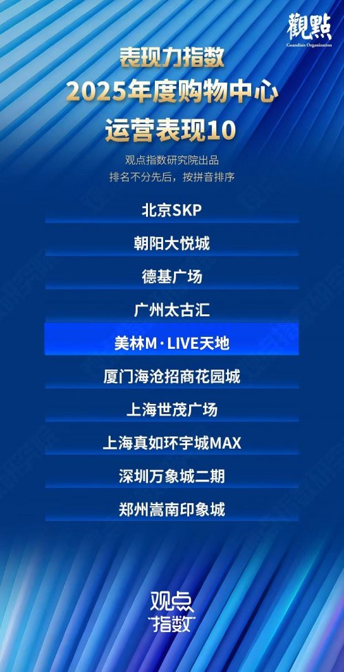 广州美林M·LIVE天地凭借卓越的商业综合服务运营能力和创新商业策略,成功入选“2025年度购物中心运营表现TOP10”指数榜单,荣获行业权威认可。