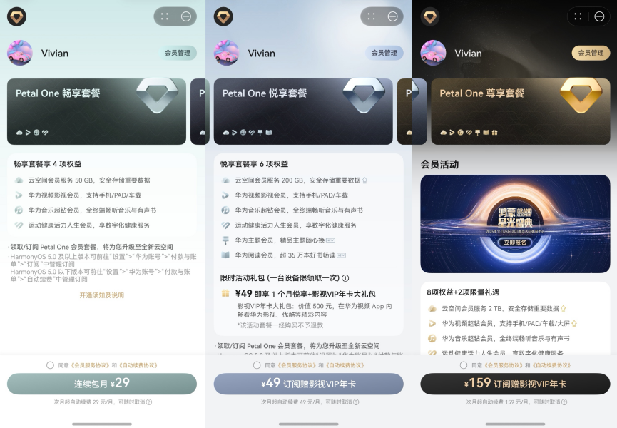 如果你也想为生活的体验做一点升级,不妨现在就从手机桌面右滑进入负一屏,搜索“Petal One或大会员”就可以进入订阅,从三个套餐中挑选适合你的用起来!现在新用户订阅悦享套餐或尊享套餐,还赠送影视VIP年卡大礼包,这个超值福利别错过,为你的每一天,订阅一份持续生效的质感生活。
