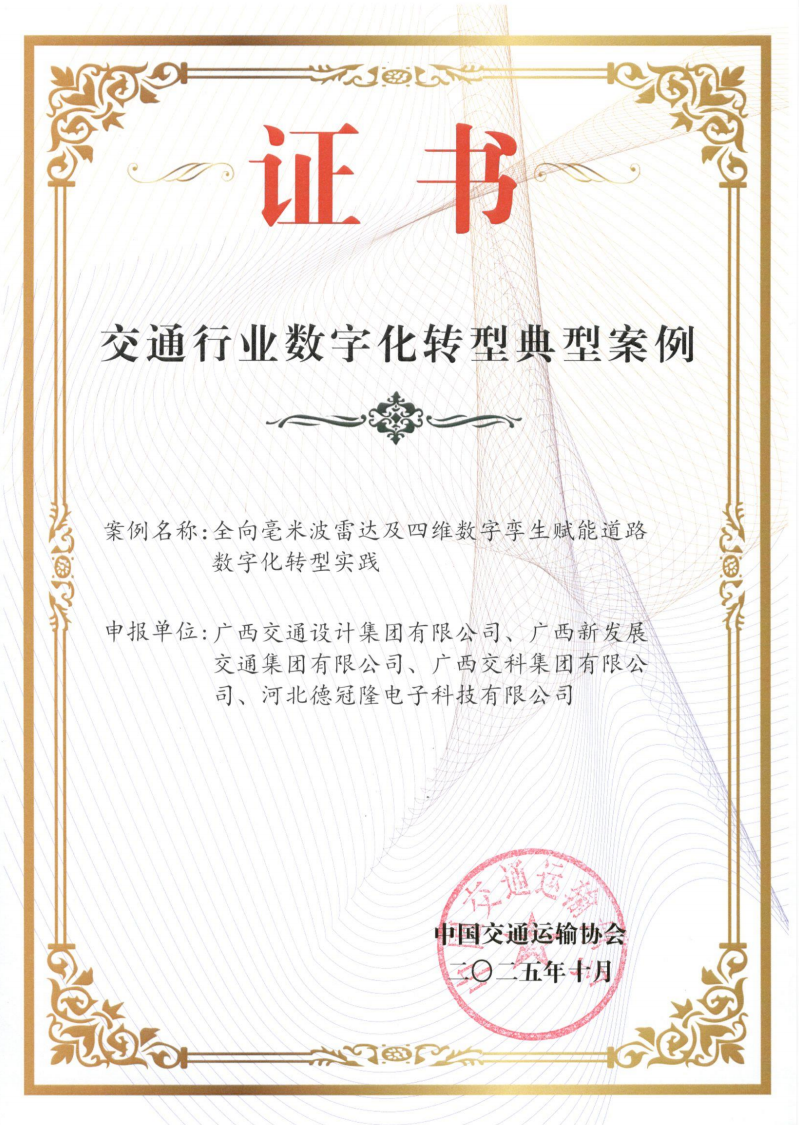 正文:行业盛会传捷报,联合项目摘得最高奖项 近日,在成都举办的第三届中国数智交通创新发展大会上,由广西交通设计集团有限公司、广西新发展交通集团有限公司、广西交科集团有限公司与河北德冠隆电子科技有限公司(以下简称“德冠隆”)联合实施的“广西S30贺巴高速来宾至都安段隧道群超远距全向毫米波雷达及四维数字孪生系统应用项目”,凭借技术创新突破与实践成效,成功斩获中国交通运输协会“数字化典型案例”最高奖项——“典型案例”。这一荣誉不仅是对项目在高速公路数字化管理领域成果的肯定,更标志着德冠隆在智慧隧道感知技术领域的核心竞争力获得行业权威认可。  攻克行业难题,填补技术空白 贺巴高速来宾至都安段全长132.897公里,桥隧比高达49%,其中都安段28公里范围内桥隧比达91%。该路段穿越喀斯特地貌区,溶洞发育、地质条件复杂,隧道群密集分布,传统监测手段难以满足全天候、高精度的安全运营与养护管理需求。 针对这一痛点,联合团队创新部署“超远距全向毫米波雷达+四维数字孪生系统”一体化解决方案。其中,德冠隆研发的高分辨率全向毫米波隧道专用雷达,彻底攻克隧道内毫米波雷达杂波干扰、虚拟路径等行业难题,实现全域无缝精准感知,填补了隧道内以毫米波雷达为感知主体的技术空白。该雷达监测精度对标激光雷达,整体造价不足激光雷达方案一半,兼具高精度与高性价比优势。  四维孪生赋能,构建智慧管理闭环 项目配套的四维数字孪生系统采用自主研发架构,通过融合雷达、视频、环境传感器等多源数据,构建隧道群三维时空模型。借助像素坐标反演与深度学习算法,系统可实现交通态势预测、设备联动控制及应急方案推演,将事件响应时间压缩至秒级。 同时,项目突破三大核心难点:一是解决远距大功率毫米波雷达在隧道内的抗杂波影响问题;二是实现远距大功率毫米波雷达多雷达跨越连续跟踪;三是完成多系统集成与协同,全面采用国产软件系统,摆脱对国外技术的依赖,为智慧交通自主可控发展奠定基础。 树立转型标杆,赋能全域交通升级 作为广西喀斯特地貌复杂交通场景数字化改造的标杆实践,该项目的成功落地为地方交通发展注入新质生产力。其成果已深度融入广西高速公路智慧运营管理平台,推动区域交通管理从“经验驱动”向“数据驱动”转型,为全区超千公里复杂路况隧道群的数字化升级提供了可复用的技术框架与实施路径,加速了广西“交通强区”建设进程。 在全国层面,该项目打造的“国产硬件+自主算法+孪生平台”一体化模式,成功打破高端交通感知领域的技术壁垒,为具备相似地质条件与路网特征的地区,提供了低成本、高适配性的数字化转型解决方案。目前,德冠隆已将该技术方案复制应用于20余条隧道项目,其形成的“感知-分析-决策-执行”闭环管理经验,正借助行业案例库向全国推广,为“交通强国”建设提供了极具参考价值的“广西样本”和“新发展经验”。 项目相关负责人表示,下一步团队将深化技术场景应用,推动多系统平台互联互通,构建一体化智慧交通网络,打造“全域一张图”管理模式,持续放大项目对区域经济发展与全国交通体系升级的赋能作用。
