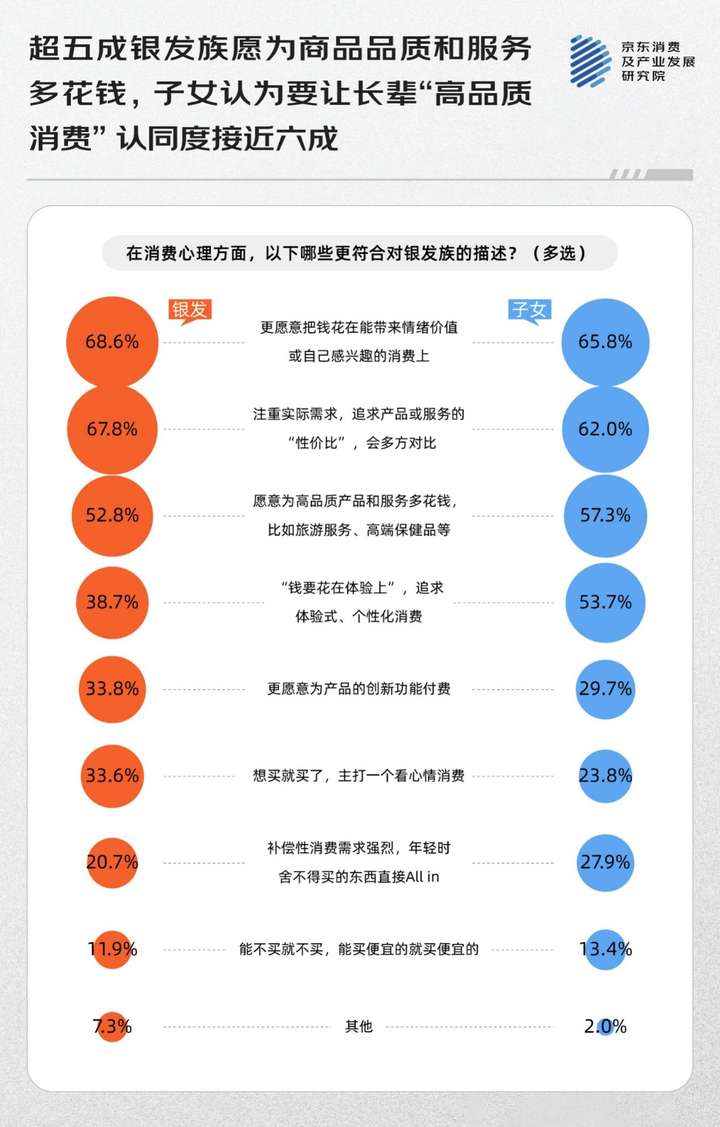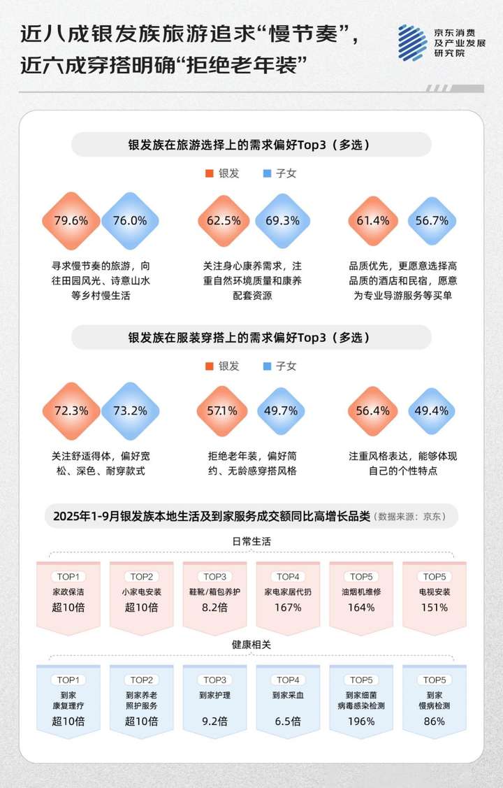 正文:当越来越多人迈过50岁门槛,中国银发经济也增添了新的内涵。传统认知中“被动养老”的刻板印象正被一群“不被年龄定义”的“年轻老人”打破,当“高能量老年人Vlog”刷屏网络,当“高精力长辈VS脆皮年轻人”成为热门话题,可以看到的是新的银发族正在影响和带动着整个银发群体走向一种“更年轻”的状态。 在《2024银发族消费报告》中我们已经看到,银发族正在跳出传统“社会时钟”,在消费、运动、旅行、护肤等领域与流行元素碰撞,“代际同频共振”的现象印证“老年轻了”的表层特征。 在对银发经济新一年的持续观察和与同行们的不断探讨中,我们认为有一个问题非常关键:银发族的真实需求与子女眼中的“长辈需求”是否一致?认知差异中又藏着怎样的缺口? 于是,今年的调研,我们共邀请到了1268位银发人群(50岁以上)与 1046 位银发子女,从生活状态/需求、精神状态/需求以及对关键问题的态度等方面进行了深入沟通,再结合客观消费数据进行分析梳理,力求找到两代人在“共识与偏差”背后藏着的当下银发经济更真实的需求与市场。 本次的调研呈现出以下关键结论: 认知重构: 超六成银发族认为自己依然年轻,并且在经历了岁月的沉淀后,拥有了丰富且宝贵的人生阅历。这些可以让自己保持朝气蓬勃和活力满满。 相对来讲,子女对父母状态的评估比较谨慎,他们更谨慎地关注父母身心状态,超六成子女觉得长辈身体状态下滑,希望他们更好地进入人生新阶段,尽情享受有钱有闲的退休生活。 但调研结果显示,两代人对“高品质享老”的期待高度一致,均有超七成受访者希望银发族可以学新东西,交新朋友,看更大的世界,高能量地生活每一天。 生活状态: “更健康的生活方式”是两代人对银发族退休后的首要期待,这种更健康的生活方式除了定期体检(66.8%)、科学饮食(63.2%)外,更包括经常运动(62.5%),银发族正在形成一套主动的健康管理逻辑,高度自律成为了他们的第一精神内核。 去旅游、旅居,学习新技能保持自我成长,培养新的兴趣爱好,结交更多志同道合的朋友,丰富精神世界是银发族给自己规划的新生活方式。他们更希望保持自主学习,提升自己的生活价值。 相对而言,在与父母有共同期待的基础上,子女们则还希望父母们在退休后可以在照顾家庭上更多给自己一些助力。与此同时他们非常支持父母通过重返就业市场来保持精神和身体上的活力,保持与社会的链接。 不过,在生活状态的多方面探讨中,我们发现,银发族对于数字产品和技能的追求和学习,远高于子女们对此的了解。比如,52.5%的银发族想要在退休的“第二人生”学习新技能,包括时间管理、财务管理、新技术应用等,保持自我成长,对此,子女感知为38.4%;银发族对扫地机器人等智能家电类产品(57.6%)、AI手机等智能电子产品(56.8%)、智能马桶等智能家居产品(54.3%)、智能机器人(40.1%)的关注度明显高于子女认知,子女感知的选择率依次为52.7%、41.1%、49.7%、32.8%。 健康管理: 在健康管理上, 57.4%的银发族与68.9%的银发子女表示已增加健康消费支出,但银发族偏好“生活方式调整”,子女更重视“硬件保障”。具体来看,银发族计划通过饮食管理、运动健身、高质量睡眠提升健康指数,子女们则会更多配置家用医疗器械、保健品、滋补品补充等方式关注父母健康指数。 面对衰老这件事,银发族们有着更加积极的应对态度。近七成银发族关注抗衰,会首选通过运动(87.4%)、规律睡眠(86.3%)、健康饮食(84.5%)等方式进行身体机能调整,对于医美等新兴的抗衰进阶选项,银发族还停留在积极了解但观望的阶段,但舒敏修复、玻尿酸等轻医美需求在银发人群中客观存在。 消费理念: 银发族追求品质消费,52.8%的人愿为旅游、高端保健品等高品质产品付费,38.7%追求体验式消费,银发族拒绝将就,愿为年轻感买单,他们穿搭偏爱“无龄感设计”(57.1%)、旅游追求 “深度体验”(50.4%)、服务消费倾向“花钱换时间”(49.3%),京东数据显示,银发族智能家居、旅游产品、时尚美妆类消费显著增长。 认知重构:打破年龄偏见,从“被动养老”到“主动创造” 银发族正用自我觉醒打破固有的认知。调研显示,超过六成银发族笃定地认为自己“依然年轻,正是闯的年纪”,用主动的心态改写年龄的意义。 认知被打破的关键,是三重时代背景共同作用的结果:第一,随着医疗水平提升,老年人高质量生命时长显著延长,2024年我国人均预期寿命达79岁,8个省市超80岁,健康的身体为银发族“不认老”提供了物质基础;第二,全球“积极老龄化”(Active Ageing)理念普及,从“被动养老”到“主动享老”的观念逐渐渗透,让老年阶段不再等同于“停滞”;第三,银发族人口结构的变化,如今步入老年的“60后”“70后”,是伴随改革开放成长的一代,拥有更高的教育水平、更充足的财富积累和更强的自我表达意识,天然具备打破传统的底气。 值得注意的是,子女对银发长辈的认知虽存在偏差,但并不割裂:64.3%的子女认可家中长辈“拥有丰富的人生阅历”,50.1%的子女能感知到长辈“正享受有钱有闲的退休新阶段”,尤其对长辈在家庭事务中展现的经验优势、在兴趣爱好中流露的热情,大多持认同态度。这种“部分共识+部分偏差”的状态,也为两代人认知的磨合留下空间。 更深层的共鸣在于,两代人对“美好银发生活”的憧憬高度一致。谈及银发